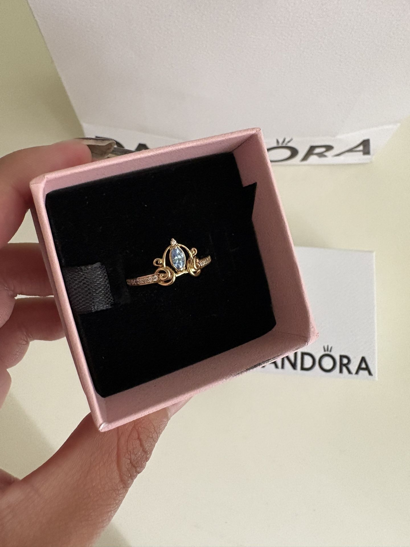 Brand new Disney Cinderella's Carriage Ring 14k gold plating Pandora - 100% authentic never used - nice cute ring color blue - size 5 also can fit a size 6 too Midnight is just the beginning. Get ready to have a ball with the Disney Cinderella's Carriage Ring, showcasing a blue marquise-shaped stone at the centre. Swirling openwork shapes in 14k gold plating form the enchanted carriage motif and connect to the ring band, which is set with sparkling clear cubic zirconia pavé on half of the band. Style it with your favourite gold-toned pieces or pair with other Cinderella-inspired pieces for a look that will shine just as brightly before AND after midnight.
