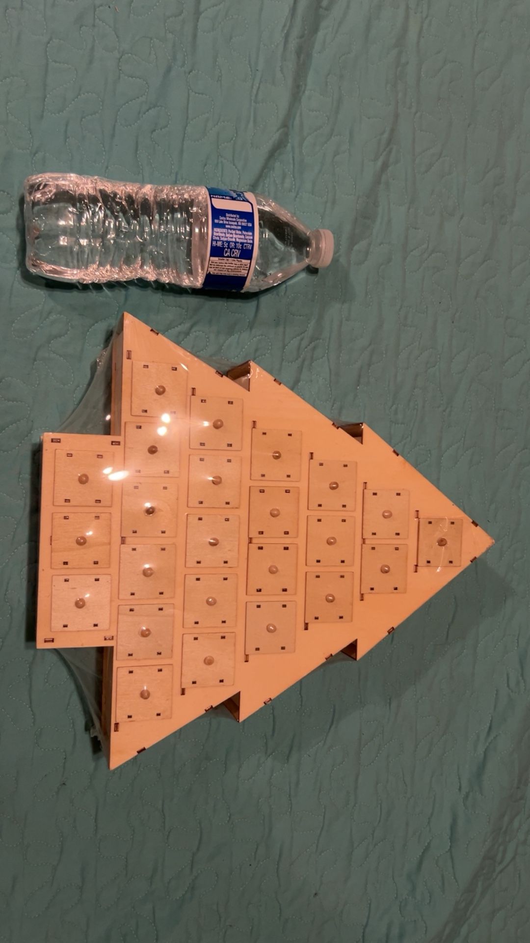 Christmas tree shaped advent calendar still in the package. Each day has a small drawer. Water bottle for scale