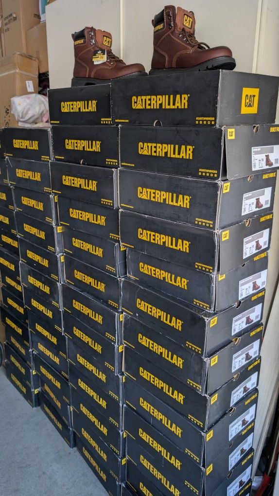 Hi guys, I have 50 pair of brand new work boots size 9 through 12. Make an offer retails for $120+. Men's Caterpillar, Second Shift Work Boot. This durable work boot style will keep your feet protected and comfortable on the job. The slip-resistant design will keep you safer at work. Full grain leather uppers with breathable nylon mesh lining, lace up closure, breathable insole keeps your foot comfortable, steel shank for added stability, rubber outsole delivers slip resistance for optimal traction, outsole for grip on low traction surfaces. BRAND NEW IN THE BOX. SIZES AVAILABLE 9, 10 and a half, 11wide, 12wide.