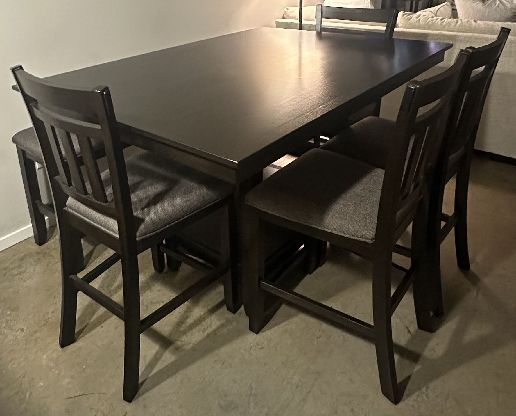 Dark brown cherry finish wood. Adjustable table Bench Depth (Inches): 16 Height (Inches): 24 Seat Depth (Inches): 16 Width (Inches): 48 Dining Table Depth (Inches): 60 Height (Inches): 30 Width (Inches): 42 Pick up only. Thanks!