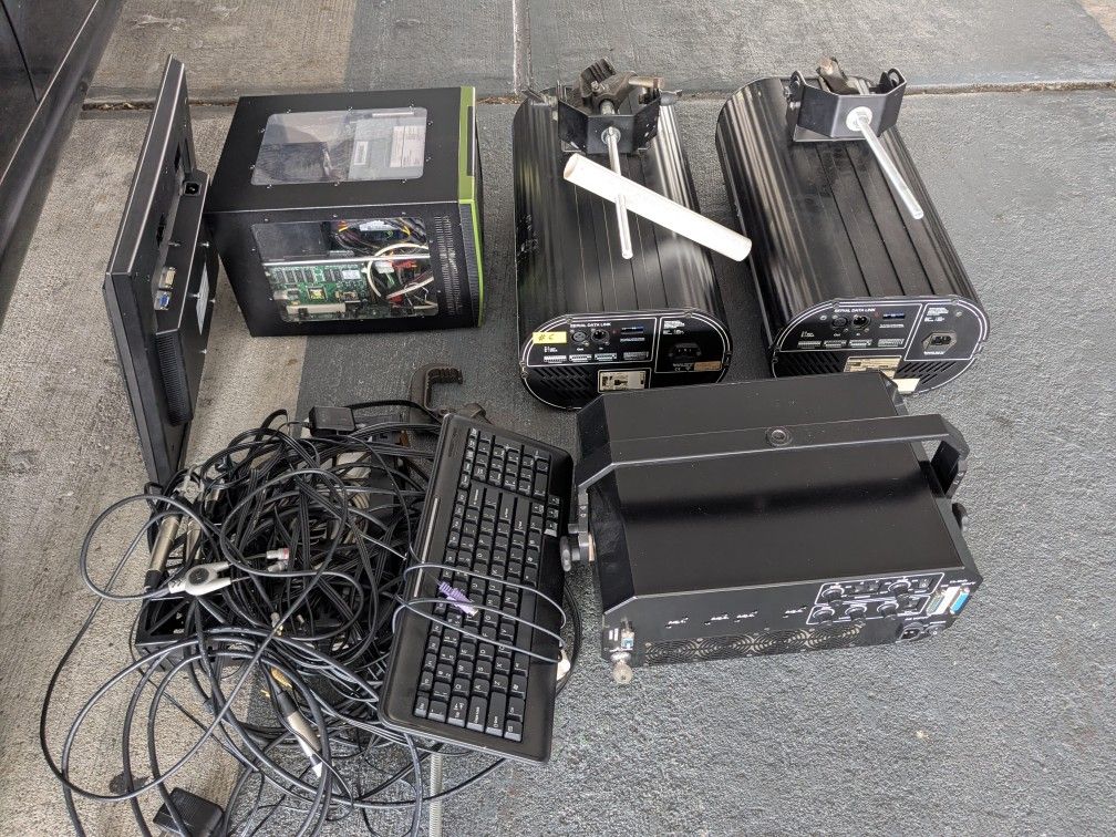 Multiple pieces pulled from a working private home entertainment room. Laser, 2 pcs. Martin Roboscan pro 518 (one has a cracked mirror) ,Computer controller with Pangolin LD2000 QM2000, monitor and various cables. I'm not sure that all the cables needed are included or how the system connects or functions. Sold AS-IS.