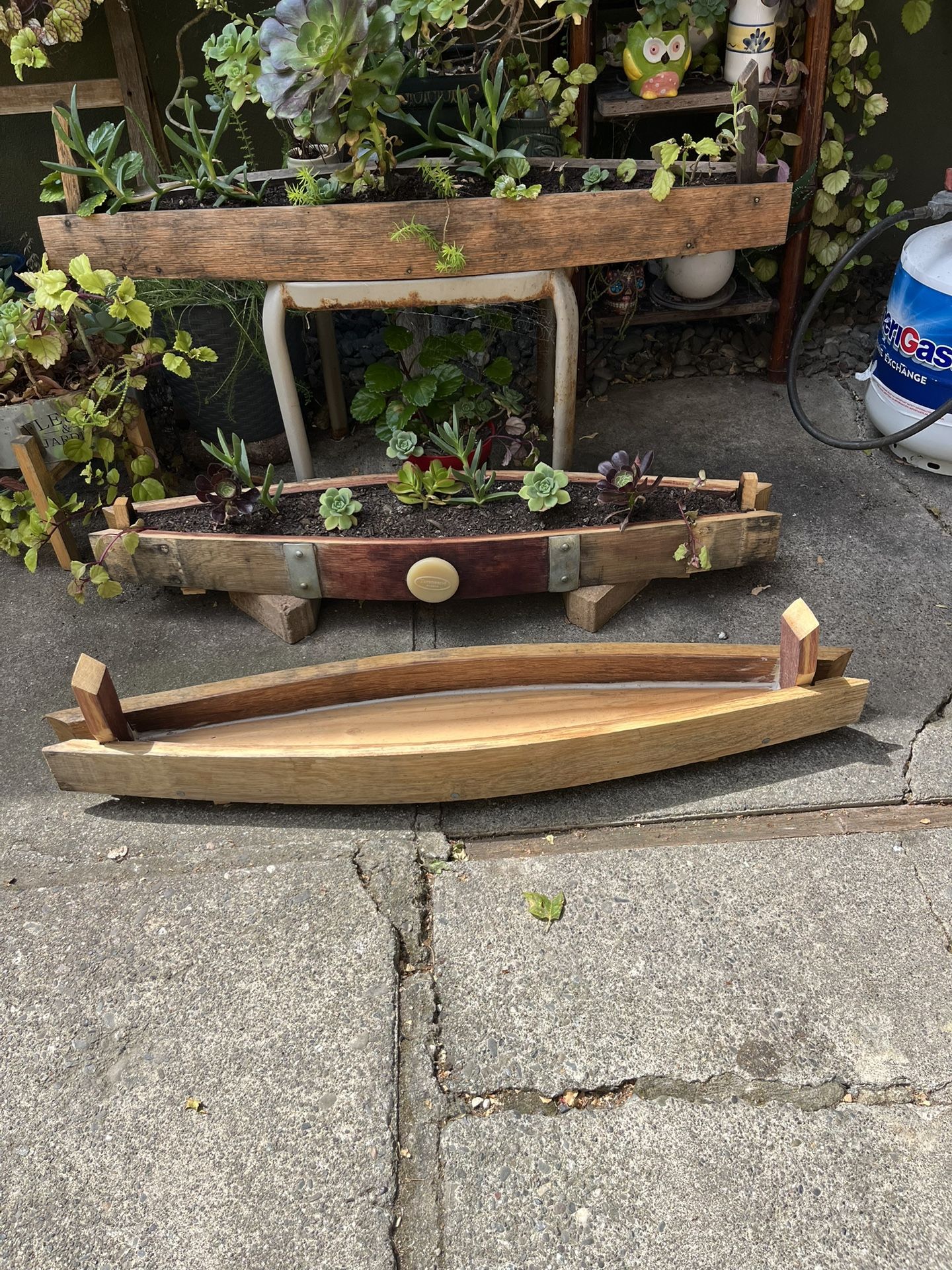 I have a few of these boat shape succulent planters made from recycled wine barrels $25 each with plants and $20 each without plants
