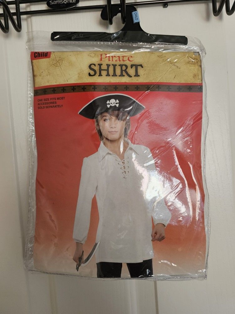 Pirate shirt child costume. One size fits most. Bought it for my 10 year old. Never worn.