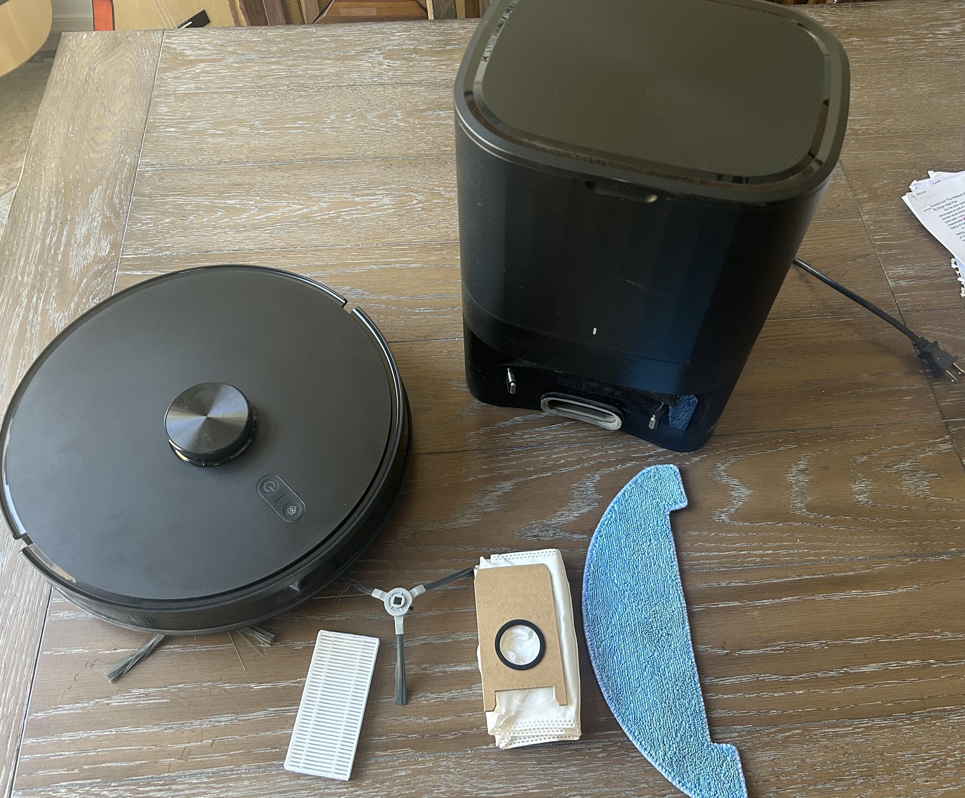 Smart robot vacuum and mop combo with self-emptying docking station. Vacuums and mops in one pass, then automatically empties the dustbin into the base so you don’t have to clean it every day. Comes with additional spare parts shown in the picture, very clean.