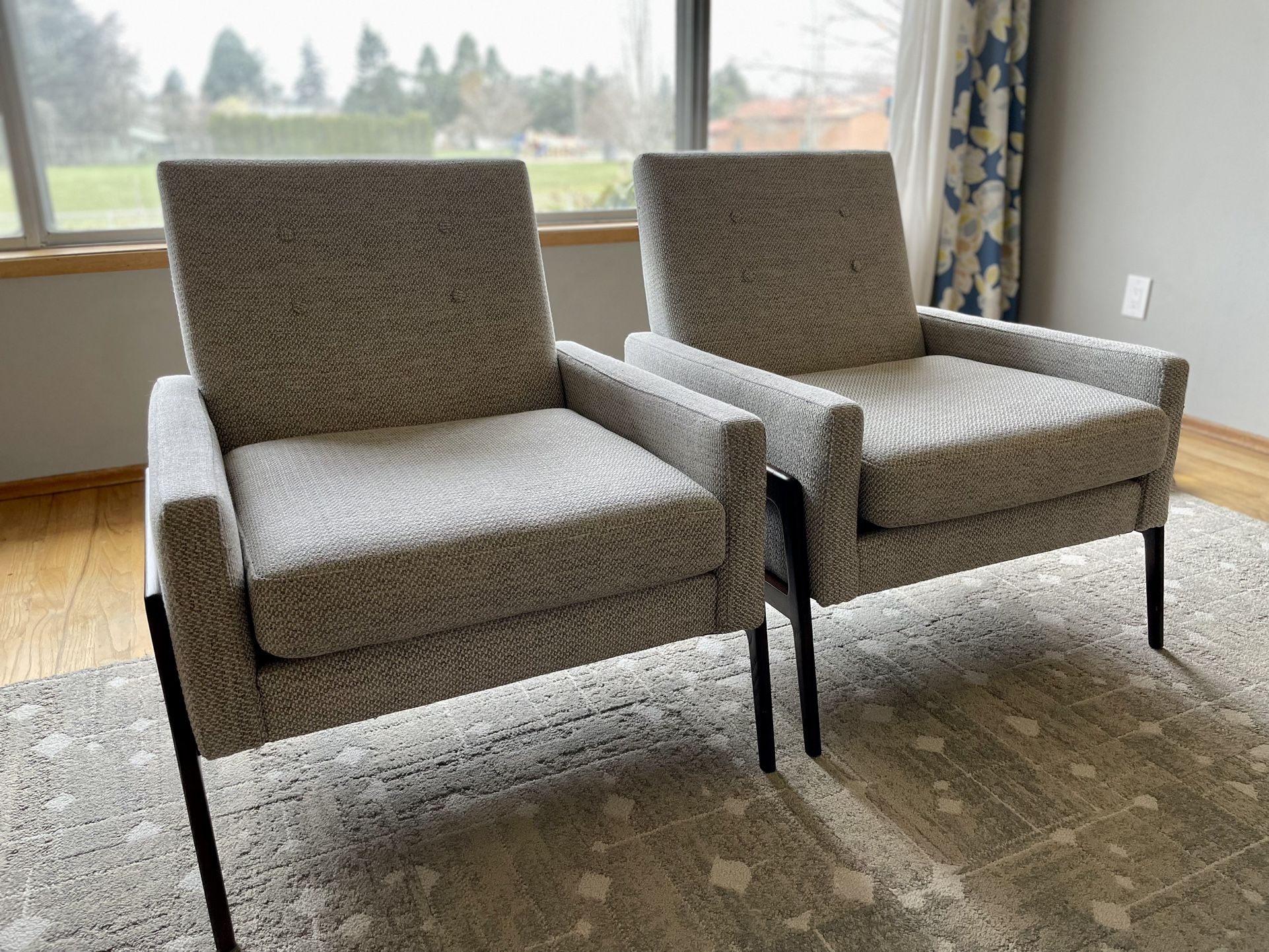 Selling a like new pair of Nord “Galaxy Gray” mid-century style fabric chairs purchased new from Article only one year ago. Lightly used in a non-smoking home. Selling only because we’ve rearranged our living room and these no longer fit our space. Paid $1200 for the pair, asking $850. Would prefer to sell as a pair, but open to selling individually. - Sturdy corner blocked wooden frame - Wooden base in a Walnut stain - Pirelli webbing - No assembly required - 32"H x 29"W x 32"D You can view more details on the Article website if needed. Located in southeast Portland near Mt. Tabor.