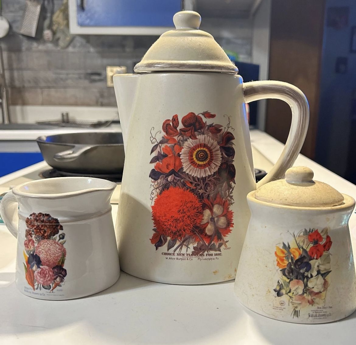 Cracker Barrel White Ceramic 9" Coffee Pot, Sugar & Creamer Garden Seeds Burpee