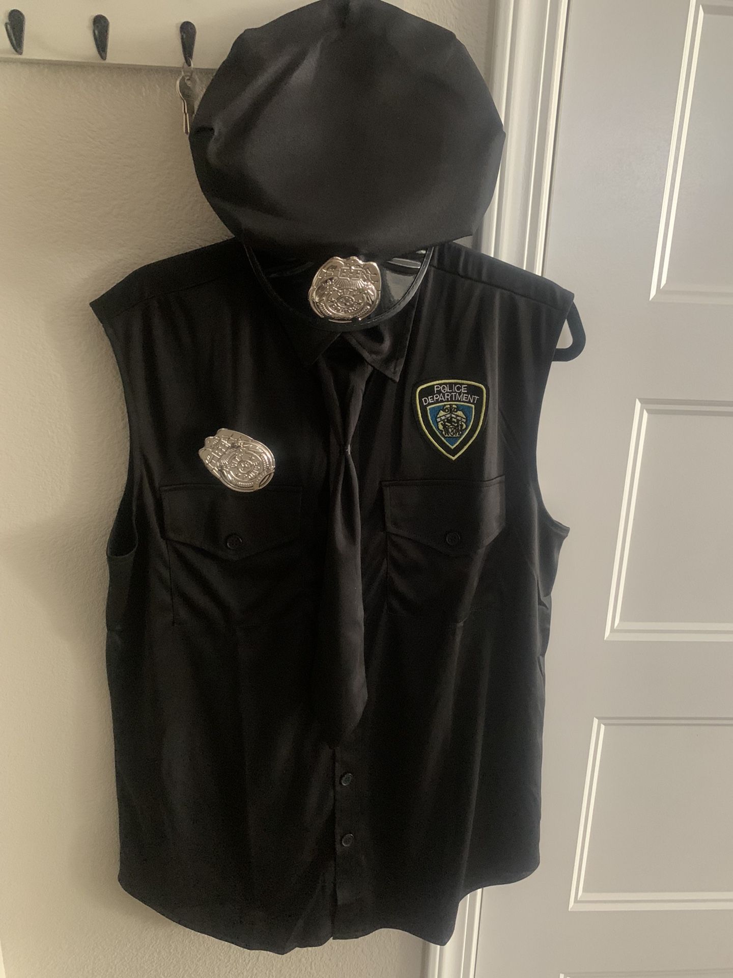 Mens/boys Cop Halloween costume - includes vest, hat, tie, arm band - medium size.