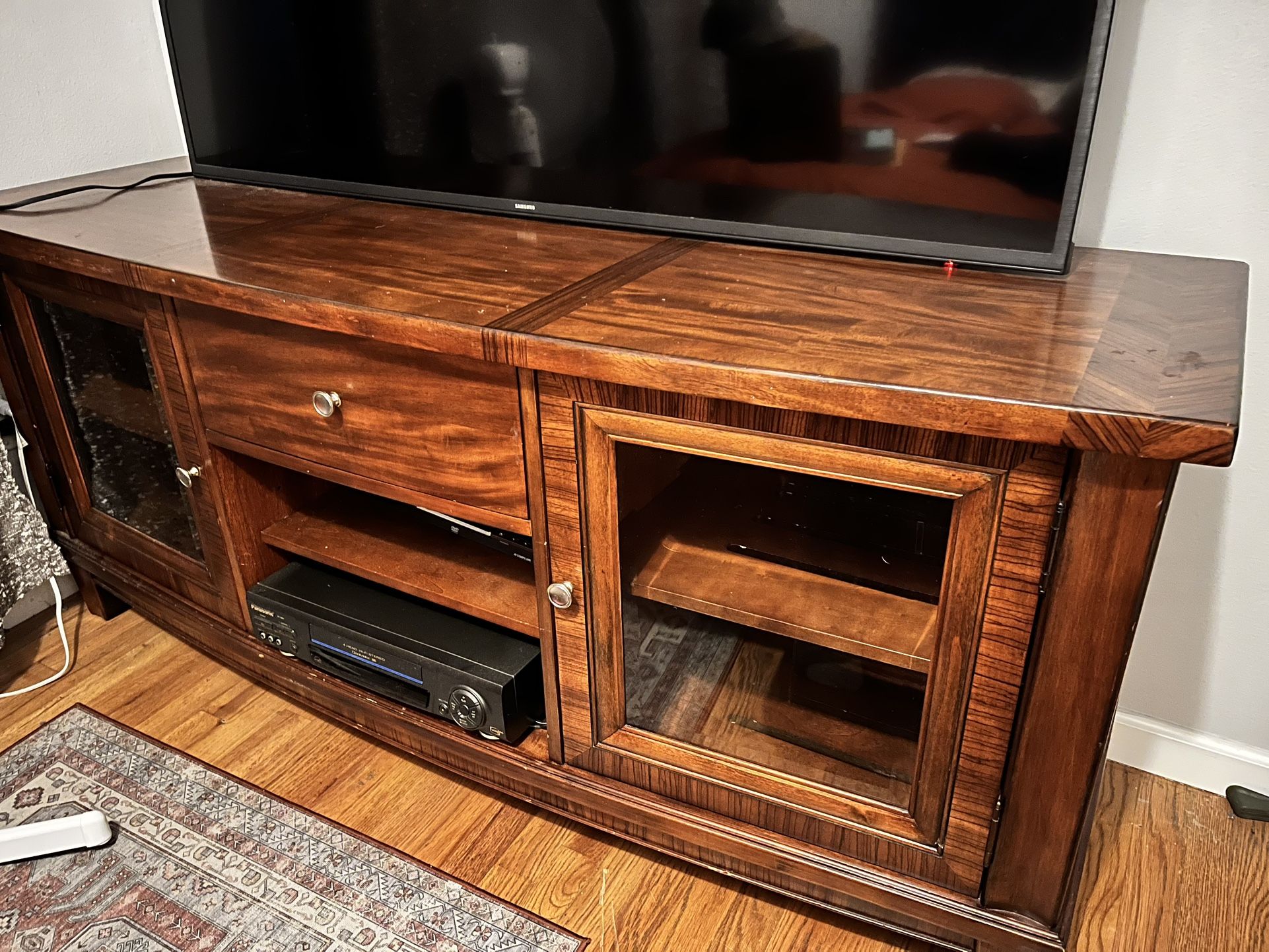 Solid Cherry Oak TV Stand It’s way to bulky we are trying to declutter You’ll need two people and a truck to haul it Hardly any scratches Glass is original and no damage Comes from clean, smoke free home and pets have never been on or around the furniture.