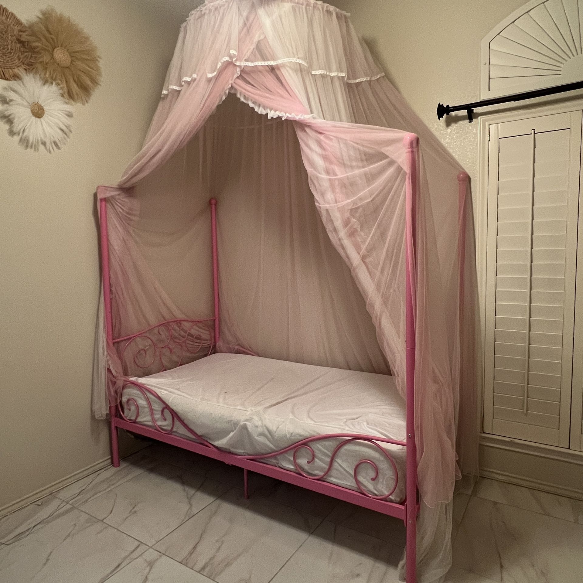 Beautiful pink princess-style canopy bed frame with decorative scroll details. Comes with a soft pink and white canopy drape that creates a cozy and elegant look. Perfect for a kid’s or toddler’s bedroom. Bed frame is sturdy and in good condition. Mattress is included if wanted, does have some stains (optional). Easy to assemble and disassemble. Great for anyone wanting a cute, fairy-tale style bed setup! Details: • Twin size • Pink metal frame • Includes canopy fabric • Good condition • From a smoke-free home