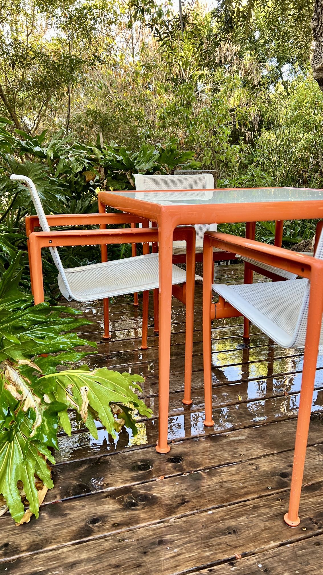 Beautiful Richard Schultz 1966 dining set Rare orange/white color combination Used but in good condition All slings and straps intact Original powder coat See photos as evidence of condition 38” 1966 dining table: Orange frame White porcelain top 38” width (square) 28” height Weight 50 lb Qty 4 1966 dining chairs with arms: Orange frames White slings and vinyl 31” height 23” width 24” depth Seat height 18” Arm height 25” Weight 22 lb Dining table retails for $3,857 Dining chairs retail for $1,841 each (total $7,364 for set of 4) Total retail price for listed dining set = $11,221 + tax Pick up/shipping: Free local pick up in San Diego, CA Free delivery within Southern California (full price purchase) I can work with your freight carrier (UShip, UKAY, others) From Knoll: Cast and extruded aluminum frame Weather-resistant polyester powder-coated finish Porcelain enamel on steel tabletop Stainless steel supports and connectors The durable, hardwearing tabletop is porcelain enamel on steel—creating a surface that weathers the elements and sets the tone for elegant dining. The refined grace of this table makes it a popular choice for indoors as well.