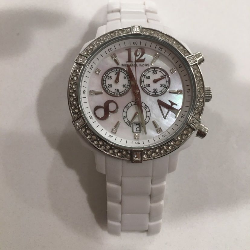 White Michael Kors Watch with rhinestones on face. Comes with the original extra links