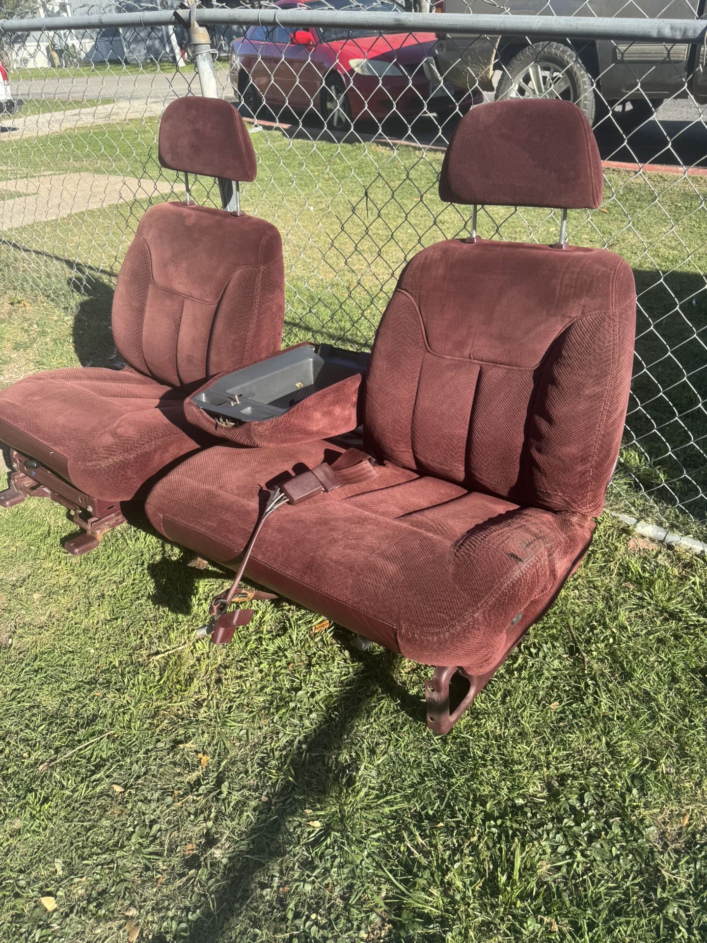 60/40 Front Maroon Chevy OBS Seats. They’re in good condition and come with all the hardware to bolt it into your truck. It also comes with the harness on both seats to use the electric buttons on both sides. Seats are partially electric. Drivers side comes with the belt and buckle for the middle passenger. The bottom of the seats also comes with all the outer plastic trims used to cover the bolts, they’re a little faded but no cracks or rips. Negotiable in person because it’s missing two levers and the top to the middle jump seat. Other than that the seats aren’t missing anything at all. The jump seat does work and can be folded or lifted. The seats have already been washed and vacuumed by me. Obo. Tambien hablo español.