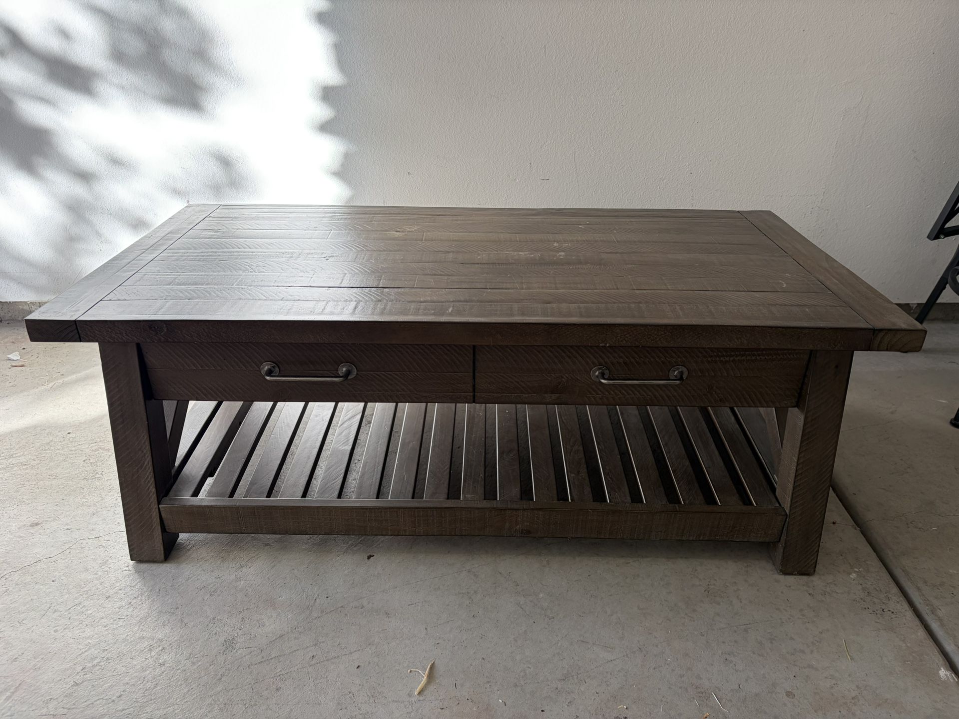 This lift-top coffee table is great for many uses, storage, game nights, tv dinners and more. Normal wear and tear and the top as a slight raised portion from lifting. table size: 52” x 26” x 19” (closed)