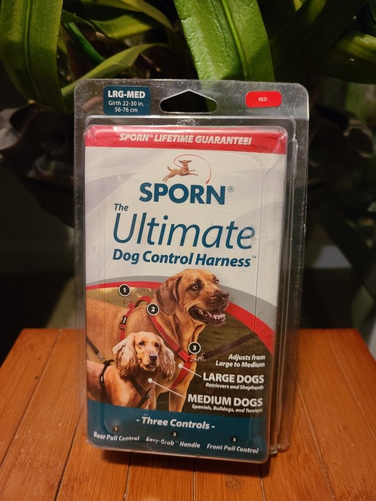 Sporn Ultimate Dog Control Harness Large - Medium Girth 22-30in RED New. The sporn ultimate control dog harness offers three methods of pool control in one harness the harness is easy to put on and has multiple options for control front control pull control or both simultaneously built in Easy grab emergency handle for close-up control padded throughout for Comfort adjustable around the chest and girth reflective stitching for safety fits 22-30 in girth and fits breeds like cocker spaniel beagle Labrador Shepherd color is red