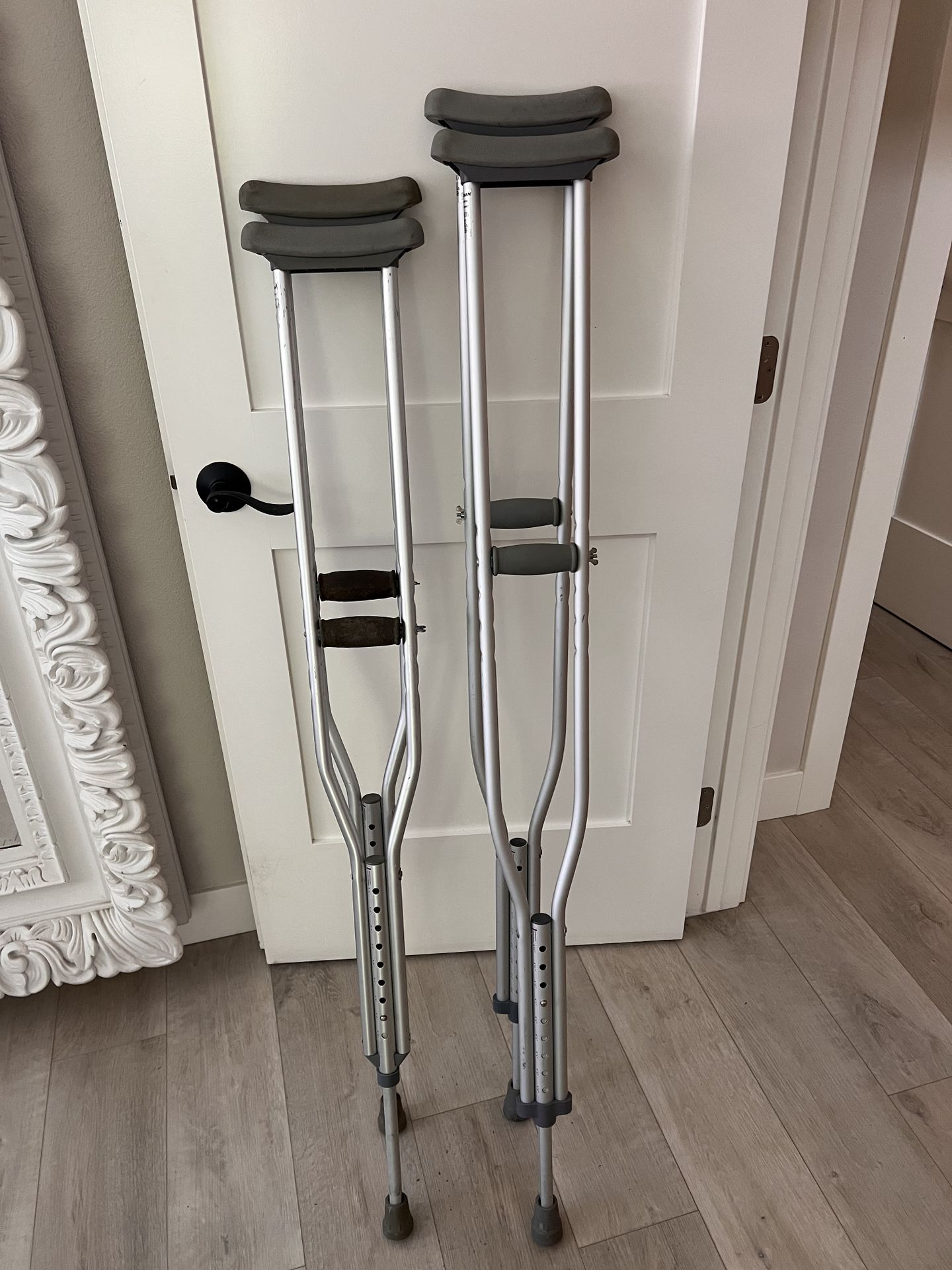 I have 2 sets of crutches. One accommodates 5’2” to 5’10”… the other serves 5’10” to 6’6”. Each pair I’m selling for $15 (not both pairs for fifteen)