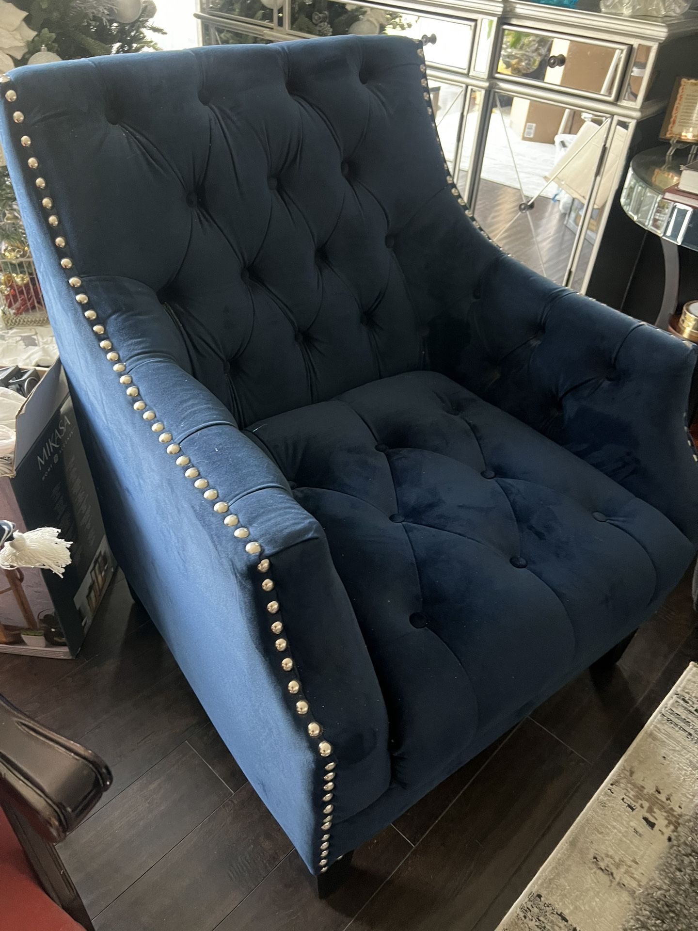 Very stylish 2 arm chairs velvet with silver studs .. in a great condition like new .. bought it from Jerome’s $450 each .. asking for $380 for both .. need to change decor . Navy blue color .