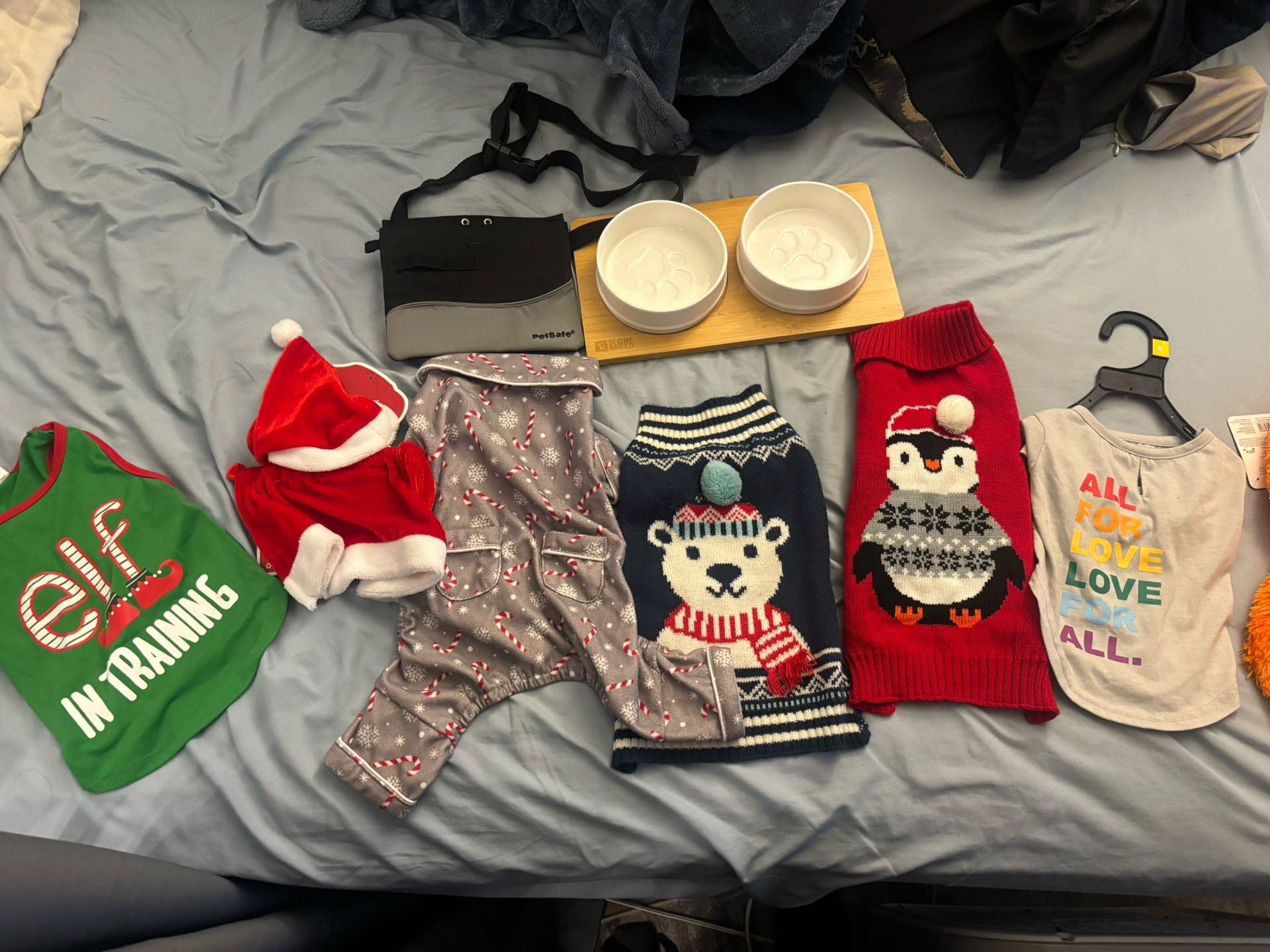 🐾 Premium Small Dog Seasonal Gift Pack 🐾 This meticulously curated gift pack is ideal for a small dog owner seeking high-quality, seasonal accessories and essentials. All items are brand new, unworn, and unused. 📦 Package Contents: * Seven (7) Seasonal Small Dog Outfits: A complete collection of unworn, unused pet apparel, perfect for holiday and seasonal occasions. * "Be One Breed" Premium Food Bowls: A set of durable and stylish feeding bowls. * PetSafe® Pet Trainer Pouch: A convenient and practical pouch for carrying treats and essentials during training or walks. $65 obo