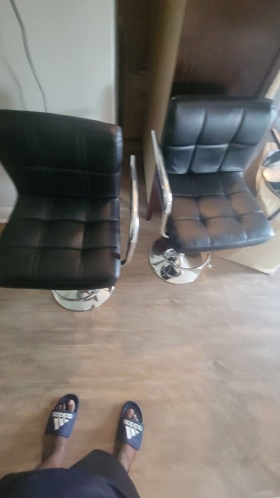 Like new there's a pic of the only damage Regular height bar stools please don't ask measurements I'm in manassas Extra fee for delivery depending on mileage Not real leather