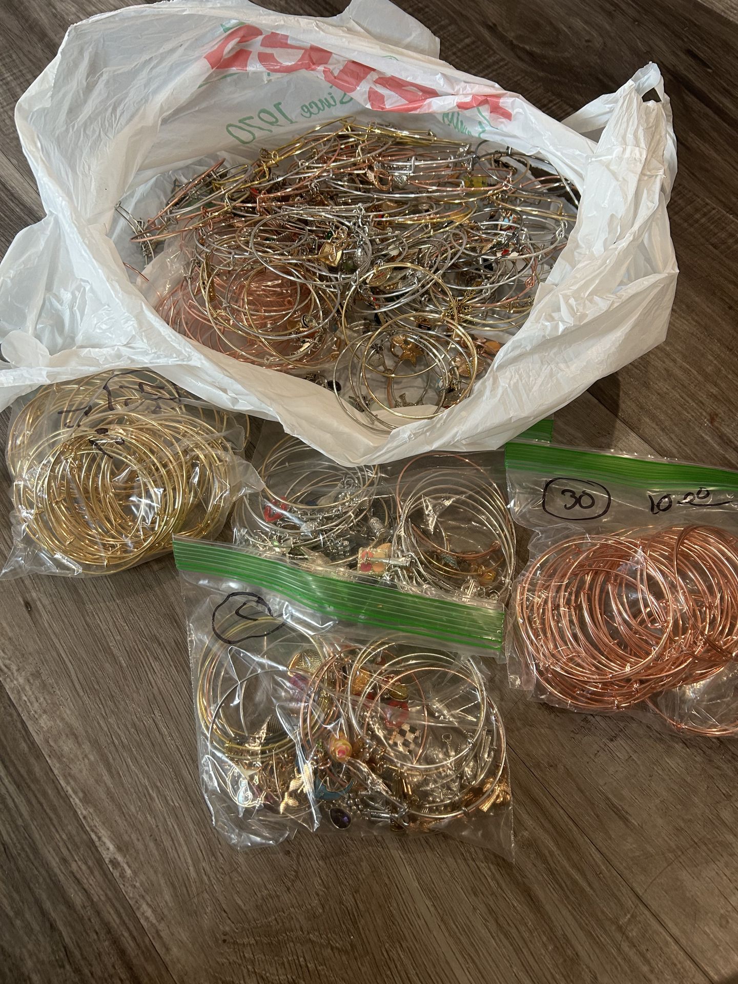All bracelets a lot of of them have all charms on them rough figure around 200 to 250 bracelets with charms, selling the whole thing together. A lot of rose gold bracelets, gold, and silver.