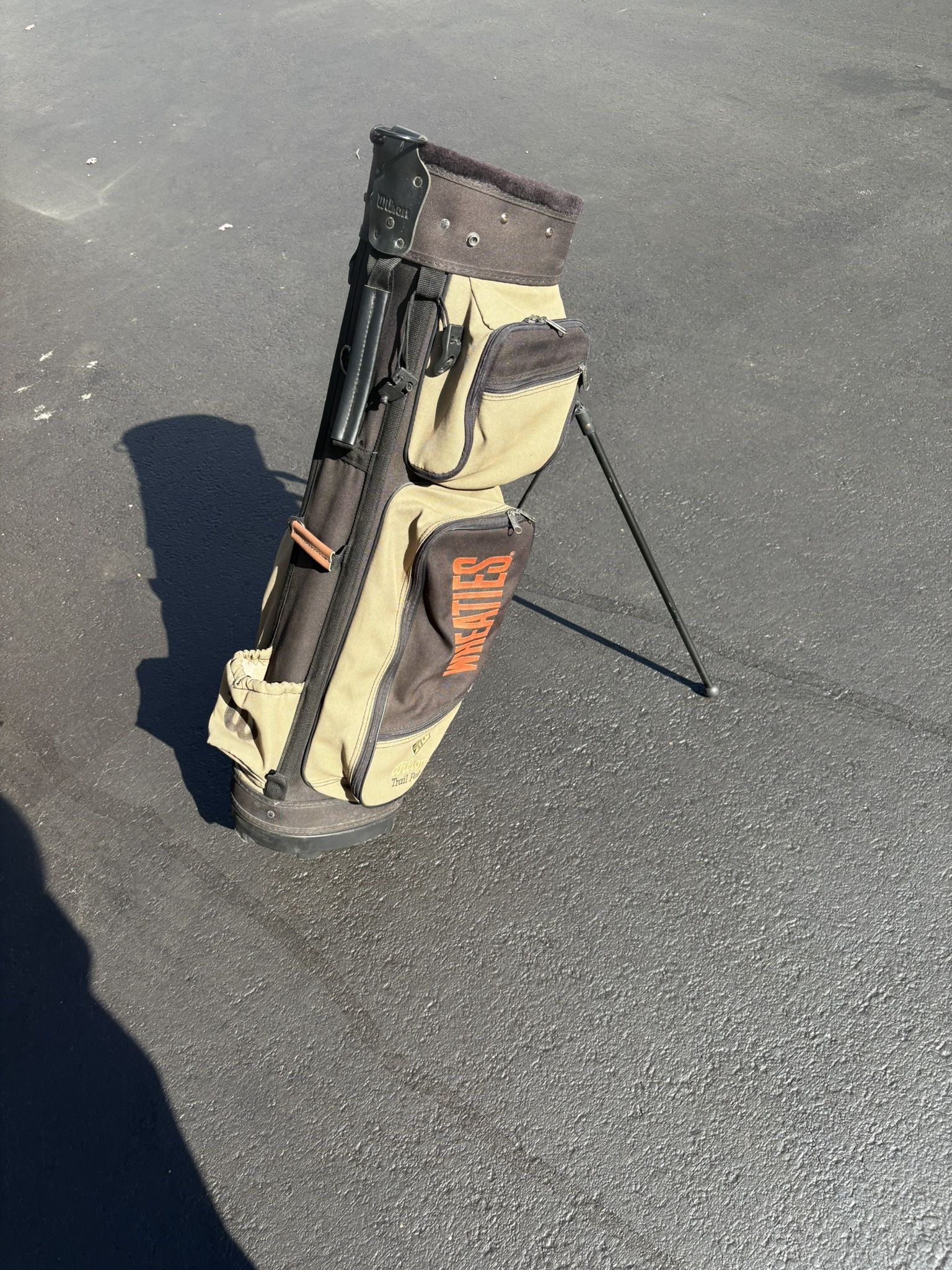 This is a bag made by Wilson sporting goods with WHEATIES Embroidered on the side. It has four pockets and a kick stand. There is no shoulder strap included in this offer. It shows even wear and minimal fade. $35 cash in South Naperville