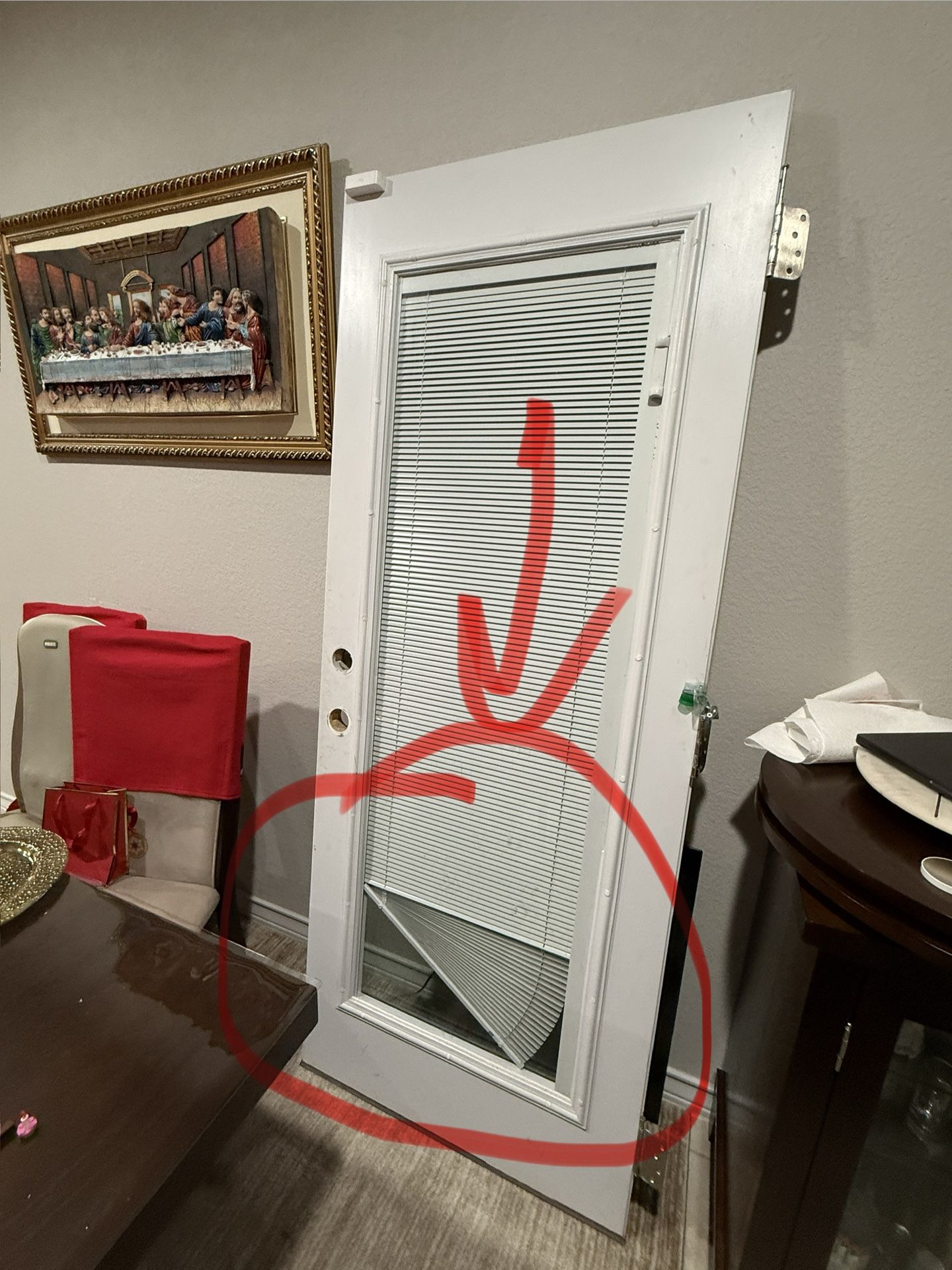 Blinds between the glass patio door and frame Just replaced because Broken blinds (got stuck and couldn’t fix, see Pic), not working properly, need fixing Width: 32” Height: 80”