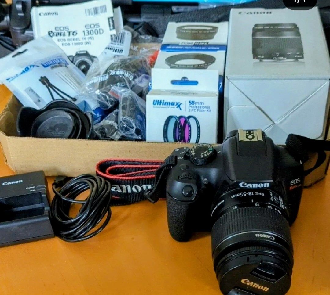 Includes Cannon 75-300mm lens, Studio Series HD Lenses, and Ultimax 58 mm Filter, table top Tripod kit, SD card, camera strap and charger. Please read last photo for complete description $250 price firm. Cash in hand Only ..pick up E Indian School/28th St, Phoenix, AZ.