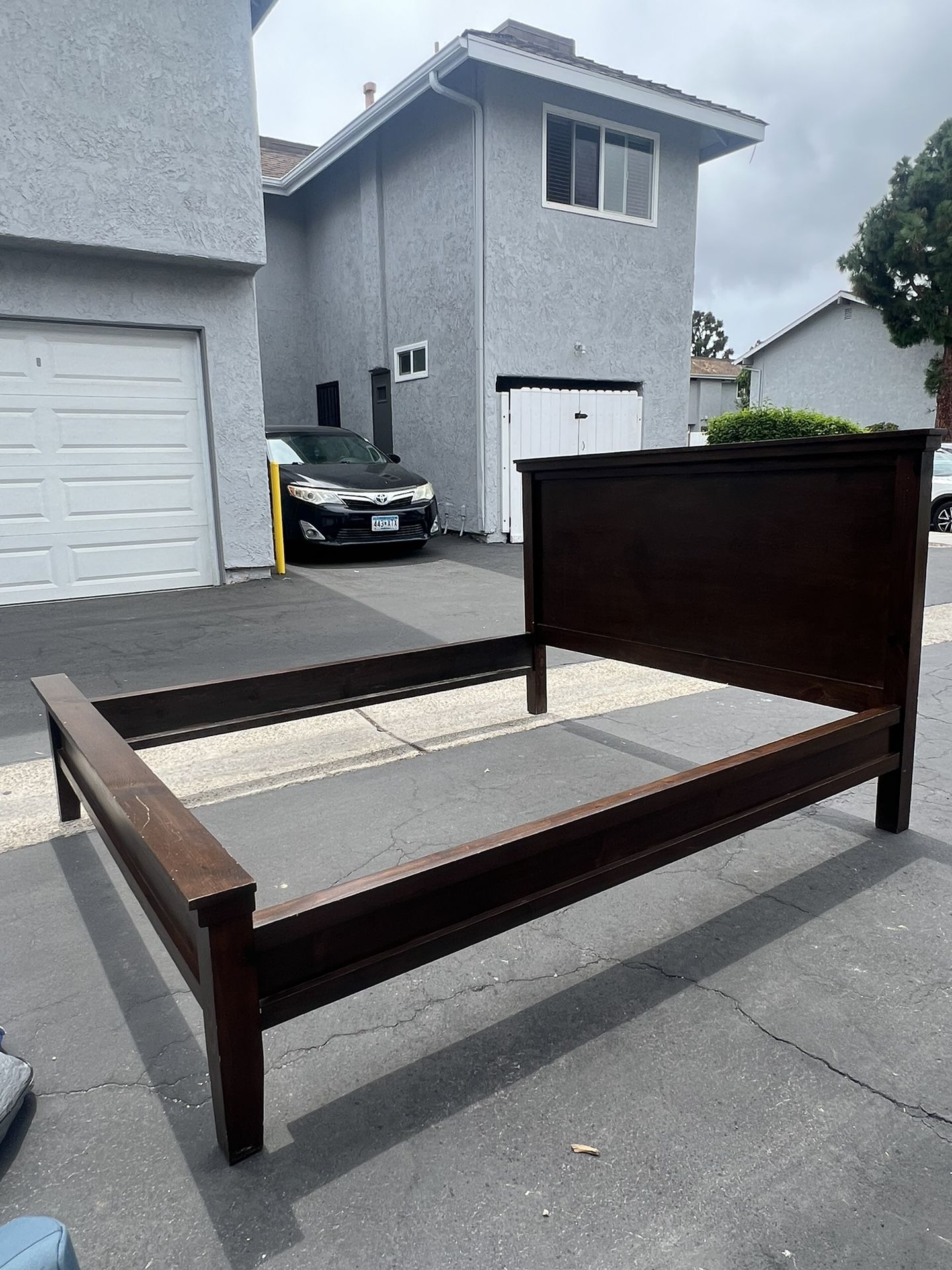 Used cali king bed frame. Minor scratches and dings but nothing major. Bed frame is solid. Does not include slats.