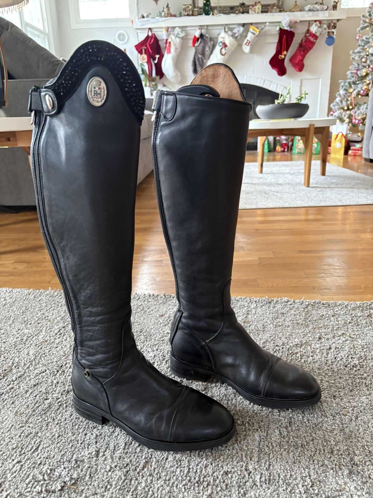 Stovall Romitelli Dressage Boots size 36 ( 5-1/2-6-1/2 ) Height from heel to top 17” calf approx 11 “ Great shape but the heel flap has been cut off.