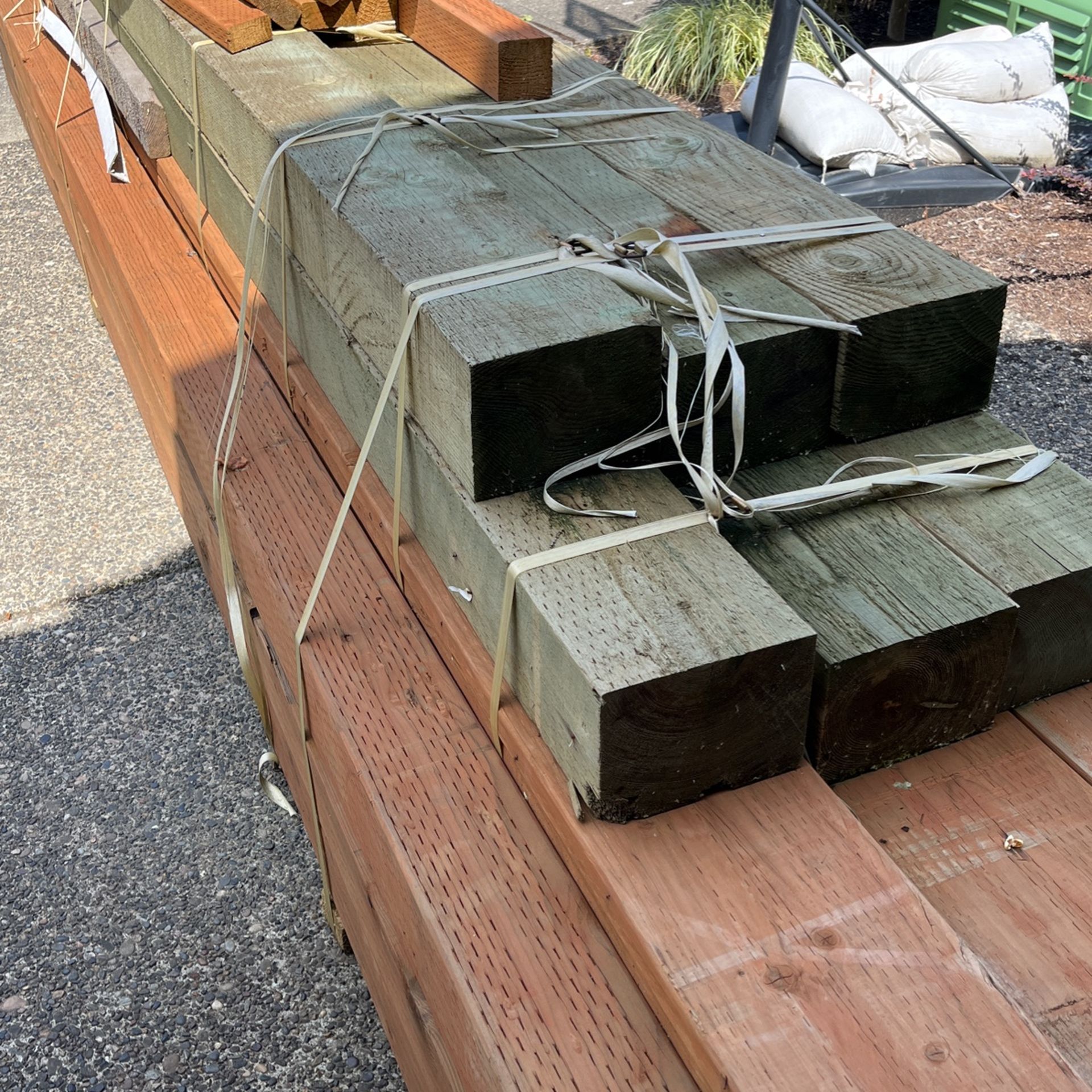 Treated beams for sale the green ones in this picture. $75 each timber or $400 for 6 timbers.