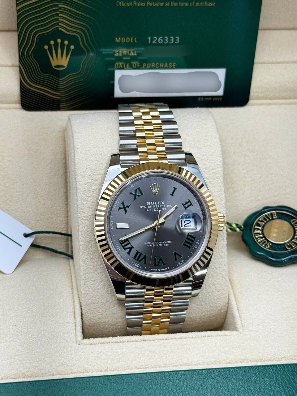 Like New 2021 Rolex Datejust 41 41mm Wimbledon 126333 Jubilee Bracelet 18k yellow gold stainless steel box papers green Roman full set