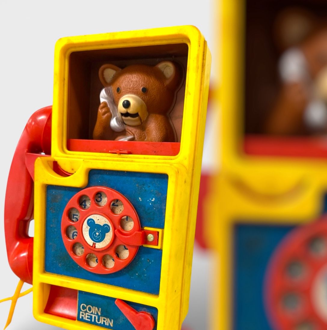 Vintage Ideal Teddy Bear Telephone toy by Ideal Toy Corp., dated ©1977 (marked on back). Classic wall-style coin telephone design with rotary dial, red handset, and pop-up teddy bear figure that appears when dial is used. Back panel features molded “Telephone Switchboard” with character names (Will Wrongnumber, Suzy Says-A-Lot, Aunt Chatty, Gabby Gramps). Bright original yellow, red, and blue plastic. A nostalgic 1970s preschool toy and great display piece for collectors of vintage toys or retro décor. • Brand: Ideal Toy Corp. • Year: 1977 • Character: Teddy Bear • Material: Plastic • Color: Yellow / Red / Blue • Type: Toy Telephone / Coin Phone • Country/Region of Manufacture: USA vintage toy phone, ideal teddy bear telephone, 1970s toy, retro kids toy, rotary phone toy, wall phone toy, ideal toy corp, nostalgic toy, vintage plastic toy