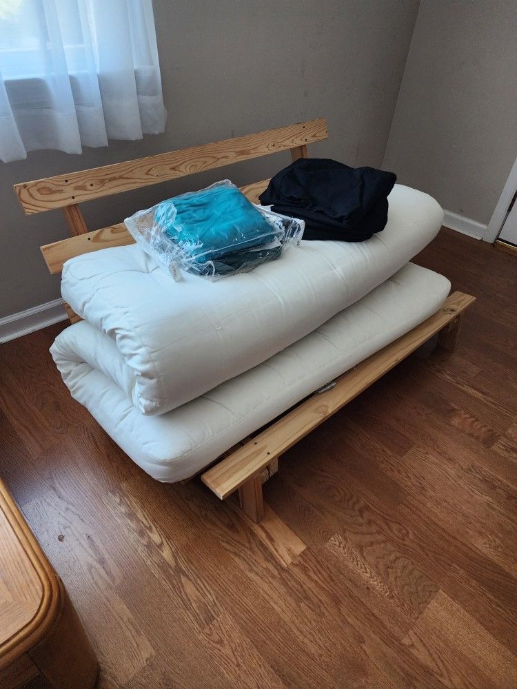 Like new...perfect condition. Mattress spotless. Three covers. Flattens out to a double bed. Pick-up only