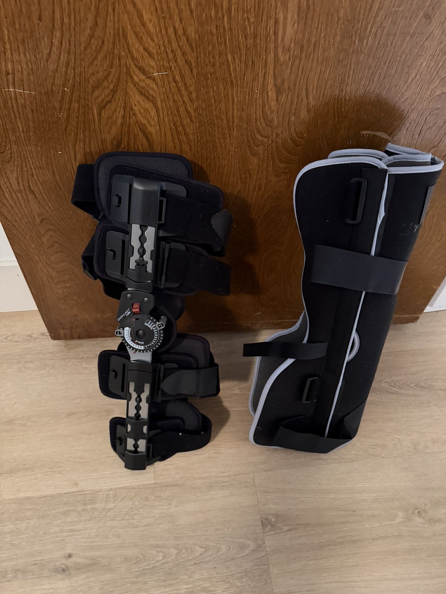 Adjustable knee brace, including knee 180 degree sleeve. Works perfect for post op recovery. Used during acl recovery.