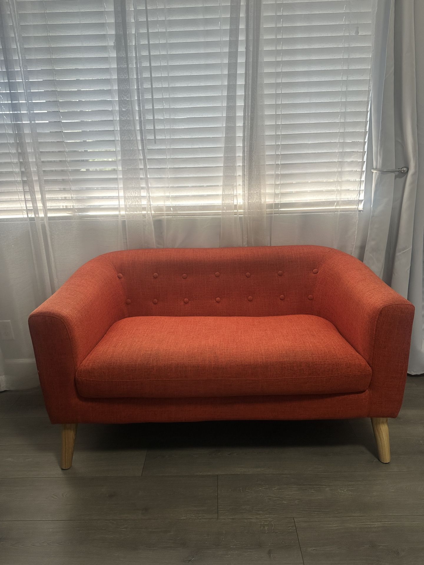 like new little two seater sofa, orange color, no stains four feet long and two feet tall willing to negotiate on price pickup required or delivery $25