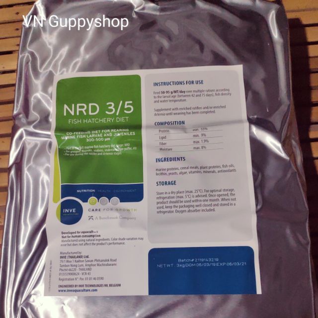 Inve 3/5 guppy fish food made in Thailand. Help grow body and color for guppy. Can feed for guppy frys.