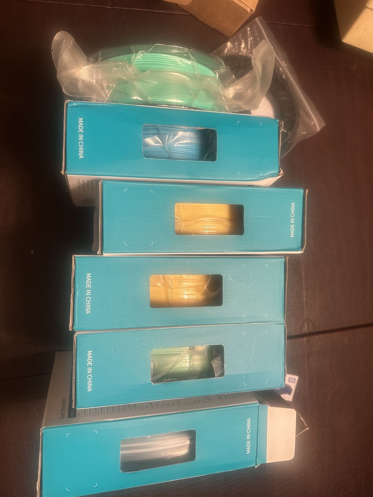 Colors are grass green, light blue, 2x yellow, lime green and green in that order. All 6 for 50 bucks, pick up in Alhambra California. Each spool is 1kg. Comes out to a little more than 8 bucks a spool.