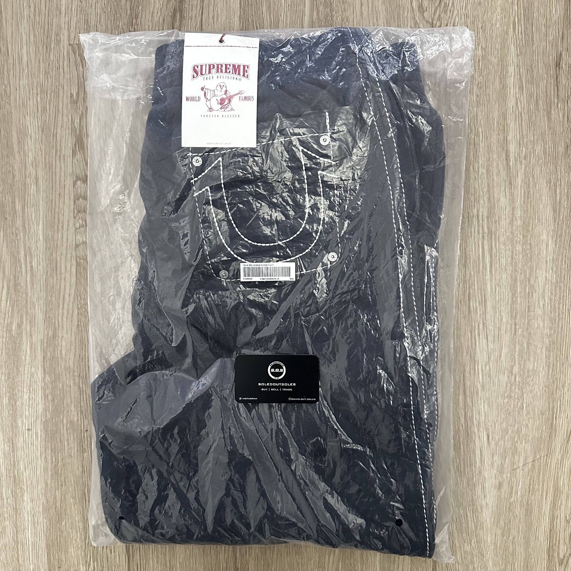 Supreme x True Religion Sweatpant (FW25) Color: Navy Size: XXLarge in Mens Sizing Season: Fall/Winter 2025 (FW25) Condition: Brand New/Never Worn (DEADSTOCK) Box: Great Condition with Original Packaging ADDITIONAL INFORMATION: Brushed-back fleece with garment wash and Big T stitch. On seam hand pockets and single back patch pocket. Elastic cuffs and waistband with interior drawcord. Studded logo appliqué and printed logo on thigh. Big T stitch logo on back pocket. Made exclusively for Supreme. - Thanks for visiting SoledOutSoles (S.O.S)
