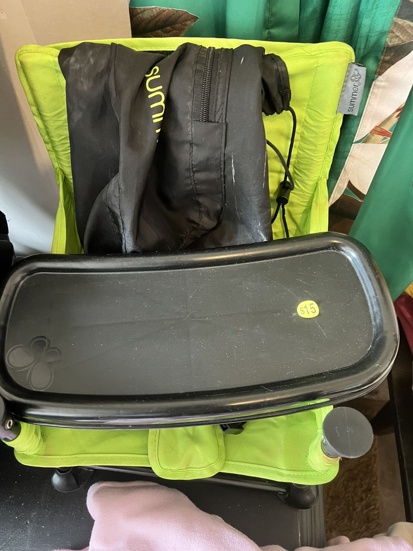 Fold up baby seat. Great for camping, in the house or on the go. Comes with tray and sleeve. Folds up easy. Great for on the go and storing for convenient use.
