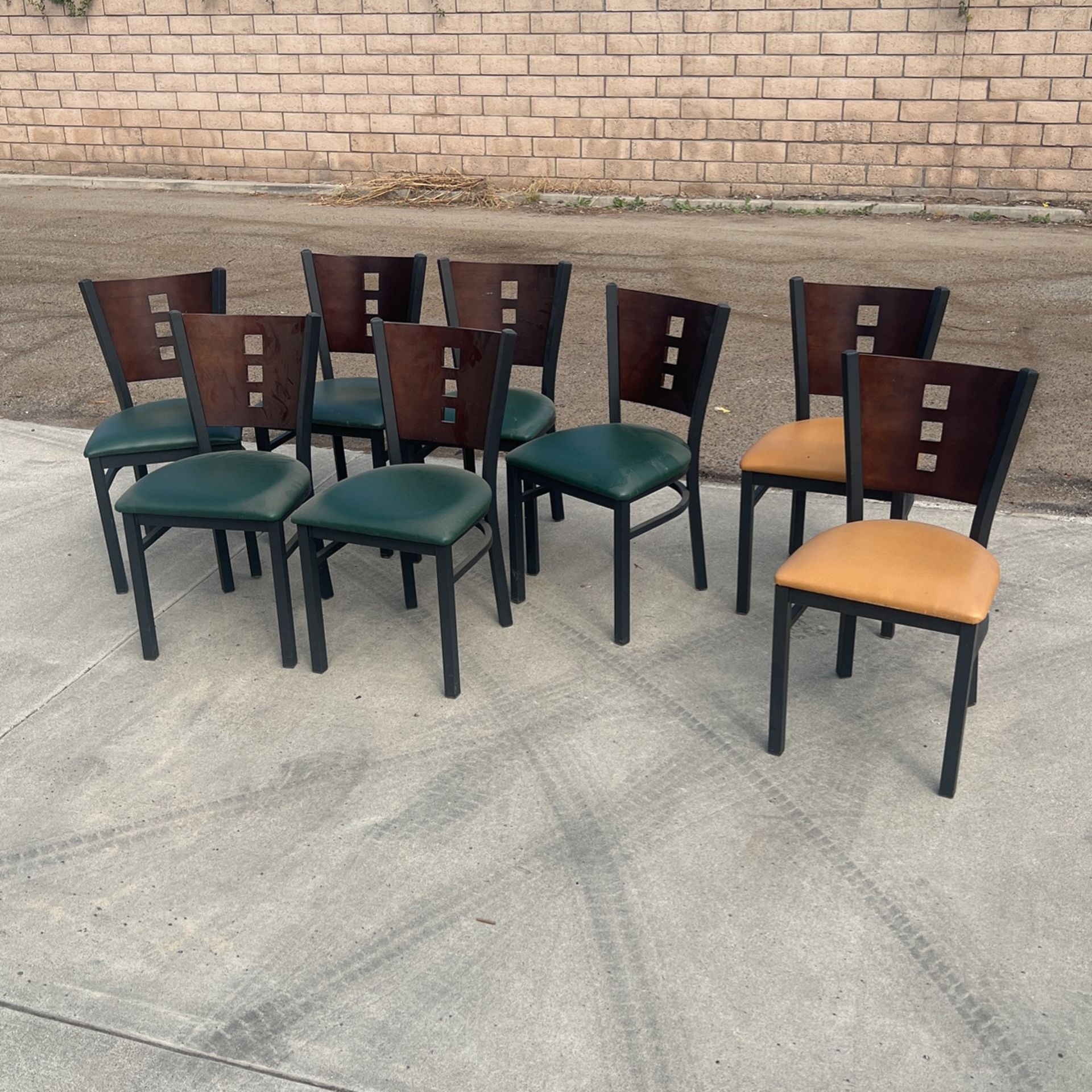 Pricing below. Pickup Only. These were used for the dining area of a quick-service burger restaurant. Good condition. Would probably be great if you’re starting your own food business or maybe you just need chairs and a table for a dining area in your home or apartment. Chairs — $28 each I have 6 green seats and 2 yellow seats. The backs are wood, the frame and legs are metal, and the seats are a soft leather. Table — $100 each I have 7 tables with their stands. It’s a two-piece inlay wood top with metal stand.