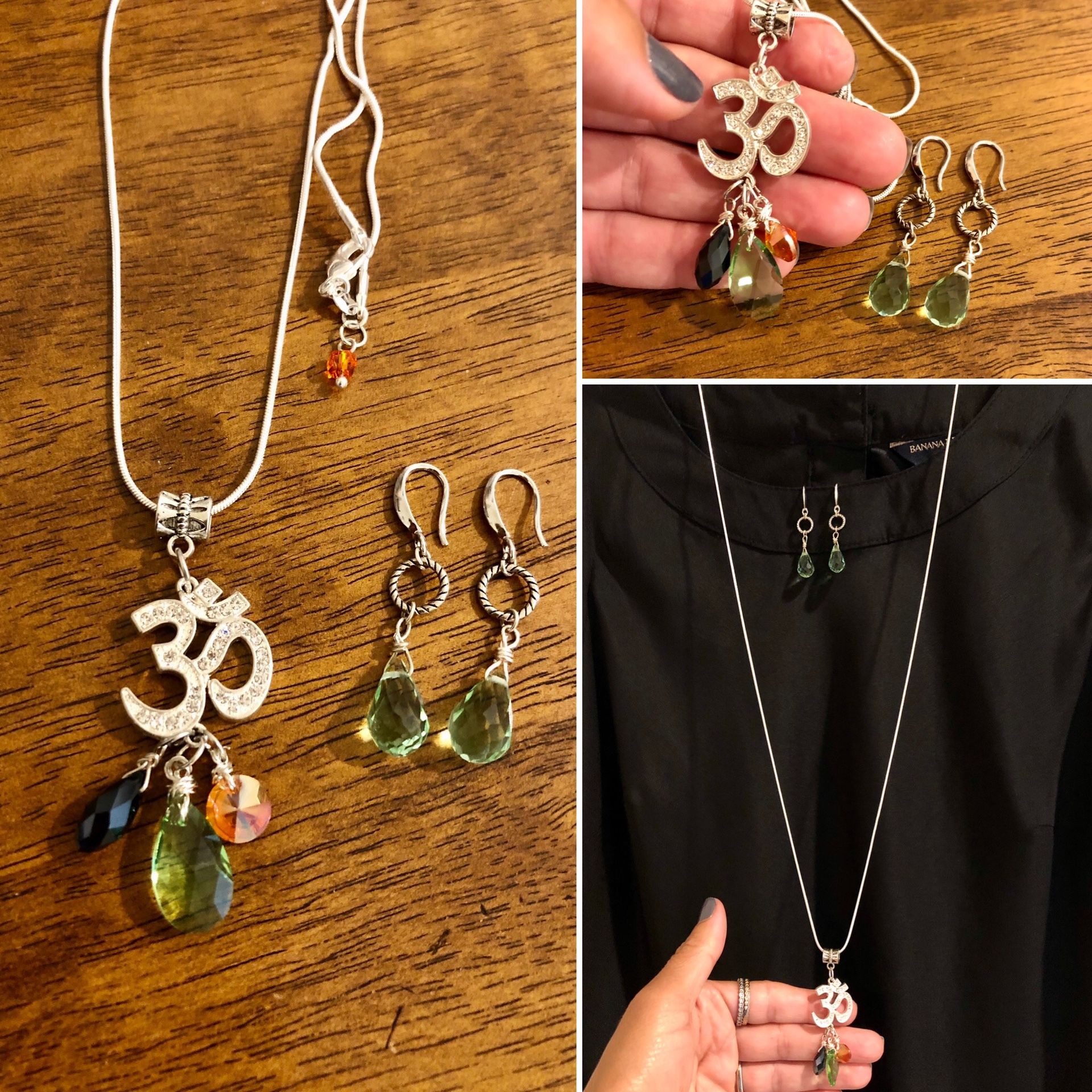 Pretty handmade necklace n earrings! OM pendant with crystals, pretty Swarovski faceted crystals pendants, 30” 925 sterling silver chain- Earrings: green faceted Swarovski Crystals, 925 sterling silver earring hooks-