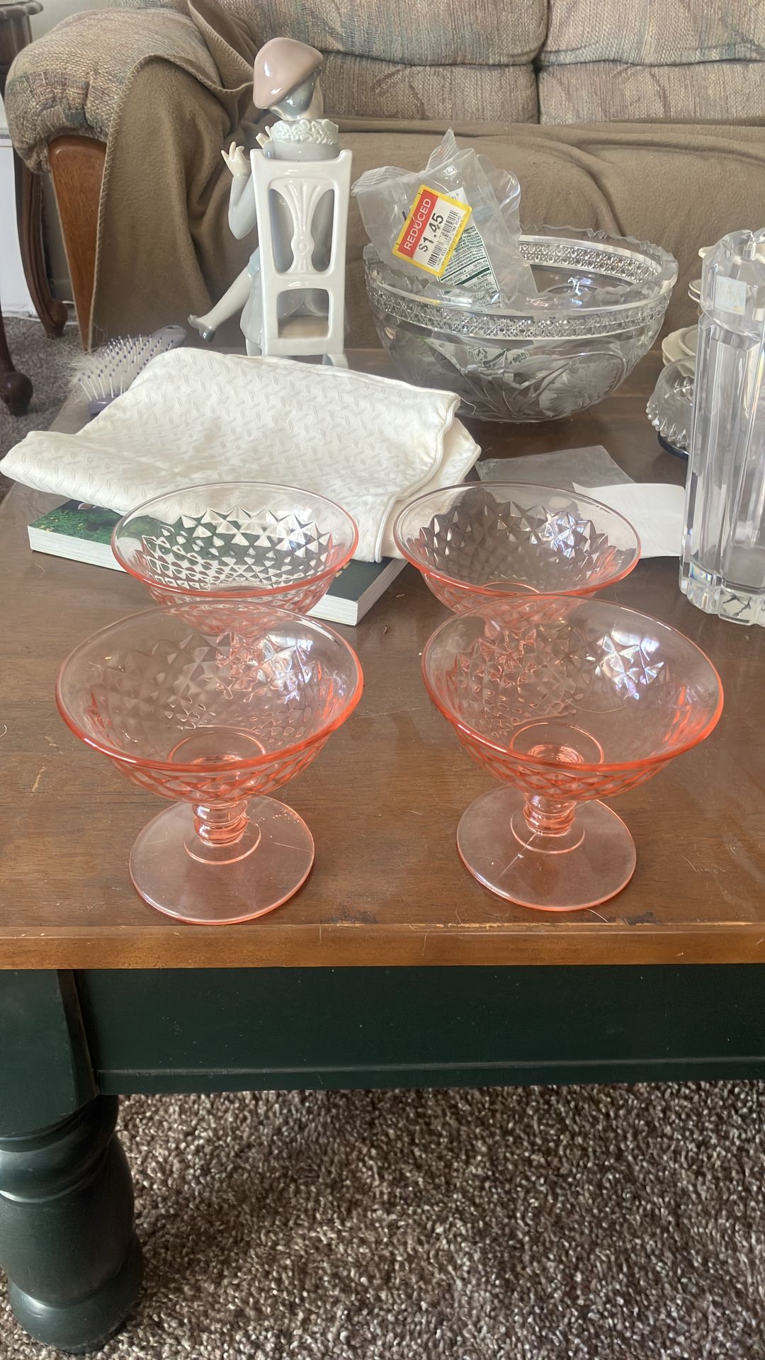 4 pink depression glass ice cream dishes