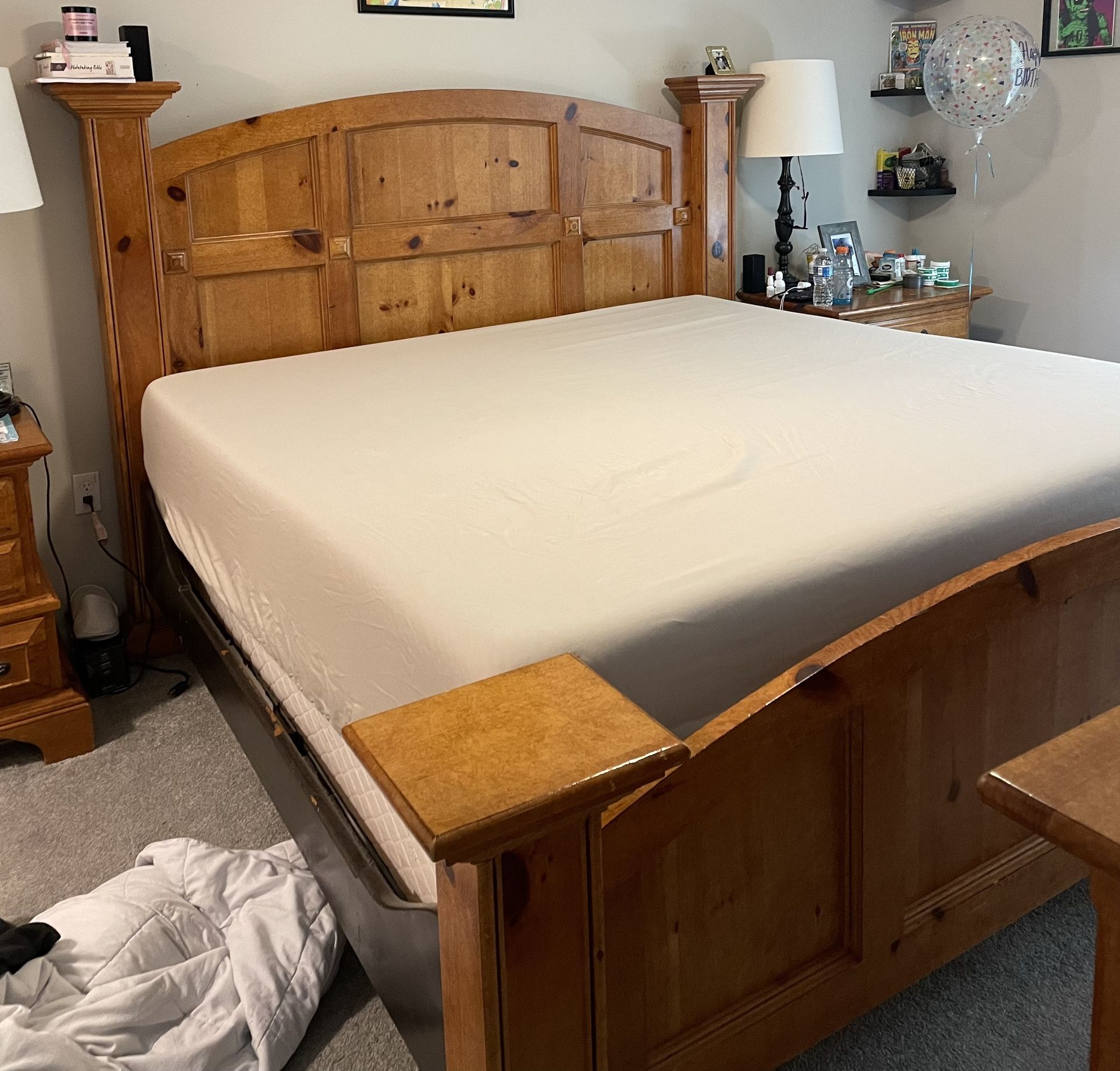 Full king bed set in great condition. Comes with bed frame, two side counters and one big dresser. Mattress not included, but the box spring is. The box spring is a motorized box spring that you can move the head and feet up and down on and adjust to your liking.