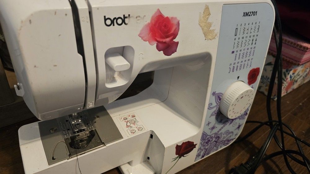 Brother sewing machine model xm2701 works well has foot pedal, just missing corner placement. As is decent condition. 60.00 firm plus sewing threads included free.