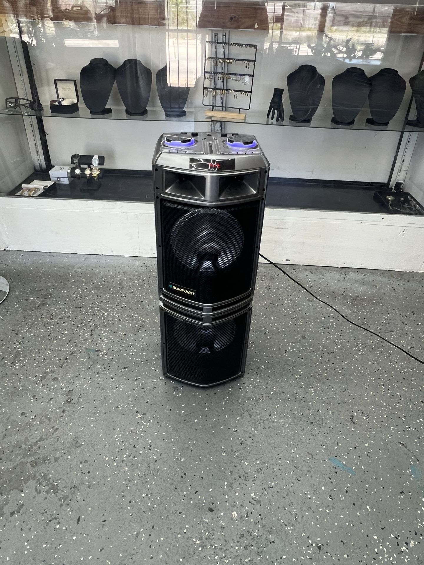 Blaupunkt Bluetooth Speaker in fair condition. Works great very loud. Can connect to guitar and microphone