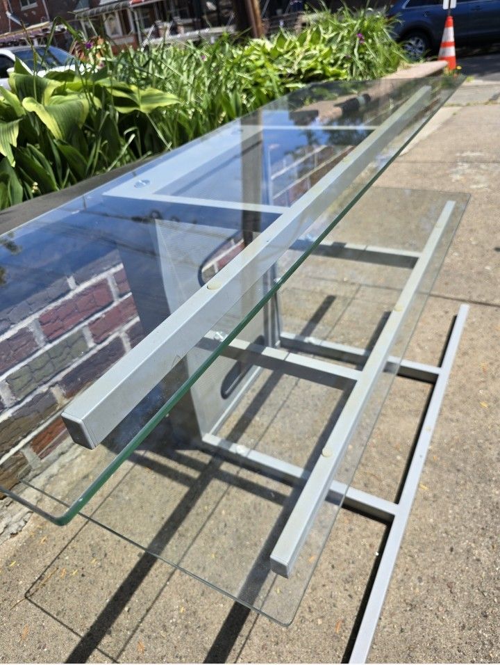 The Glass and Metal TV Stand by Bell'O is a stylish and modern piece of furniture for adults' living spaces. The stand features a solid gray color with a metallic finish, making it a sleek addition to any contemporary home decor. With its freestanding design and open storage, including three shelves, this TV stand offers both functionality and aesthetic appeal. The handle material is glass, adding a touch of elegance to the overall design. Easy to assemble with no additional parts required, this TV stand is the perfect choice for those looking for a modern and functional furniture piece. Its compact, multi-tier design with open shelving is suitable for holding a television and various audio/visual (AV) components such as a cable box, DVD player, or game console. Key Features & Information: Design: The stand features tempered glass shelves and a metal frame, likely with a chrome or silver finish, giving it a modern or contemporary appearance. The open design aids in cable management and promotes airflow around electronics. Use Cases: It's designed for use in living or entertainment spaces, particularly suited for smaller rooms due to its compact footprint. Price Range: New products in this category generally range from approximately $80 to over $150, depending on size and brand. Note: Bottom glass shelf missing.