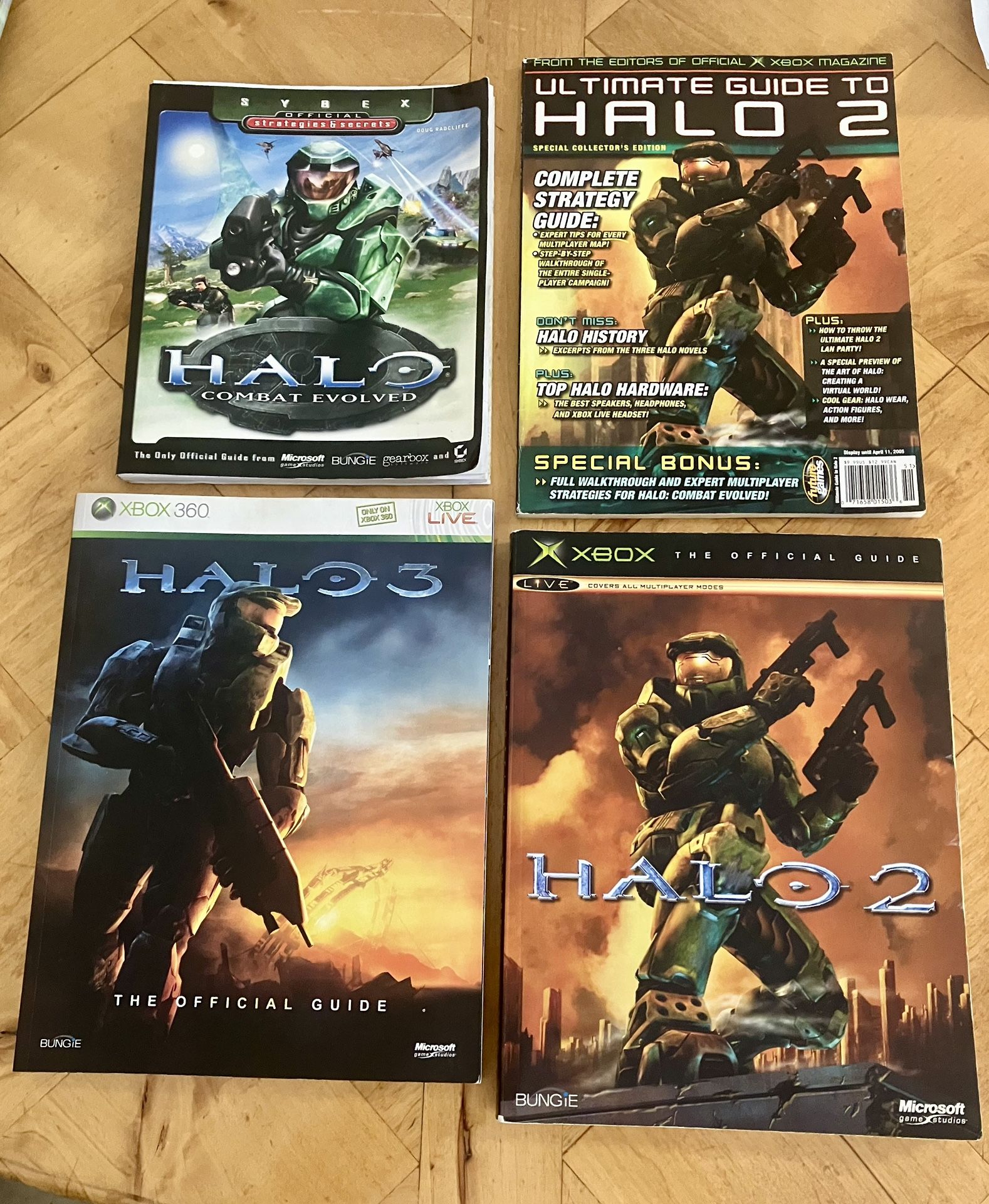 -Halo: Combat Evolved, Halo 2, and Halo 3 official strategy guides for sale. -Also includes Halo 2 magazine that contains extra special bonus with full walkthrough and expert multiplayer strategies for Halo: Combat Evolved. -Halo 2 and Halo 3 strategy guides are in like new condition. -Halo: Combat Evolved strategy guide shows signs of use on the cover and throughout the book. -Halo: Combat Evolved guide contains original poster from the game -Halo 2 magazine shows signs of use on the cover. -All 3 strategy guides contain in-depth walkthrough of all campaign missions -Halo 2 magazine displays strategies and tips for multiplayer and campaign -All 4 items listed for $30