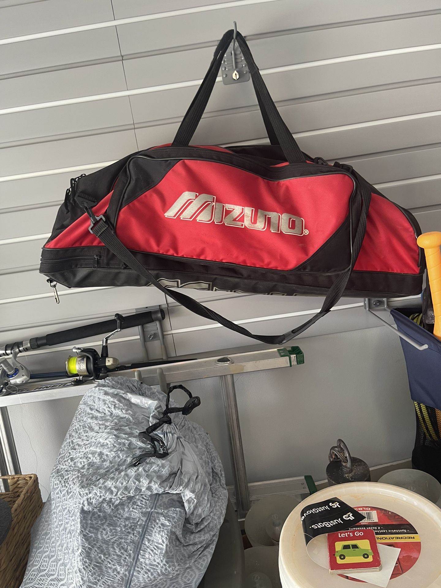 Red and Black Mizuno baseball/softball bag with multiple pockets and holds multiple bats. Catchers gears fit inside the bag!