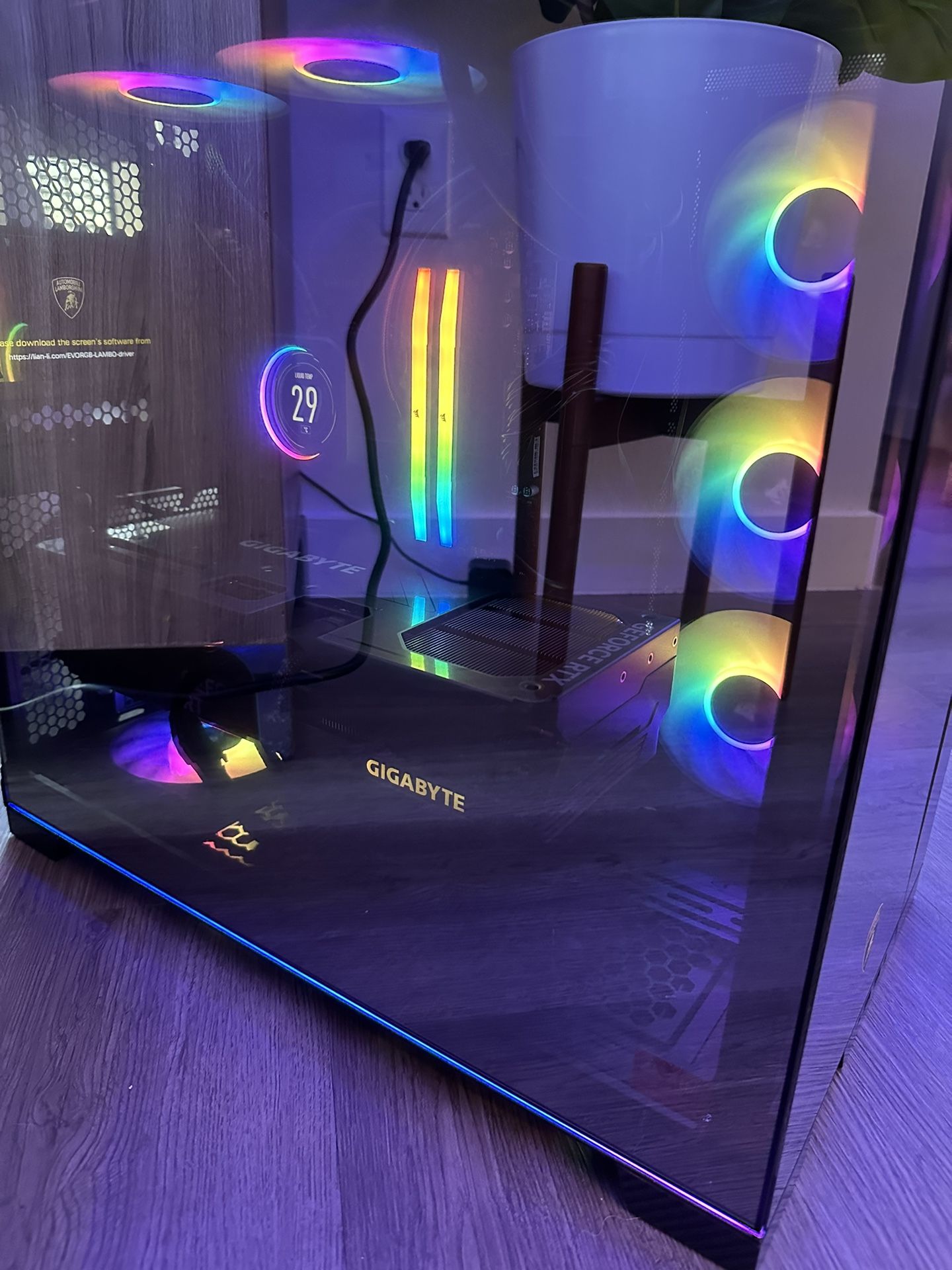 CASE: Lian Li LAMBO CPU: AMD RYZEN 9 7900X GPU: GIGABYTE 4080 SUPER MOTHERBOARD: MAG B650 TOMAHAWK WIFI RAM: CORSAIR DDR5 32GB 6000 MHZ PSU: CORSAIR 850W 80 PLUS SSD: SAMSUNG 990 1 TB COOLING SYSTEM: CORSAIR H100I LCD AIO