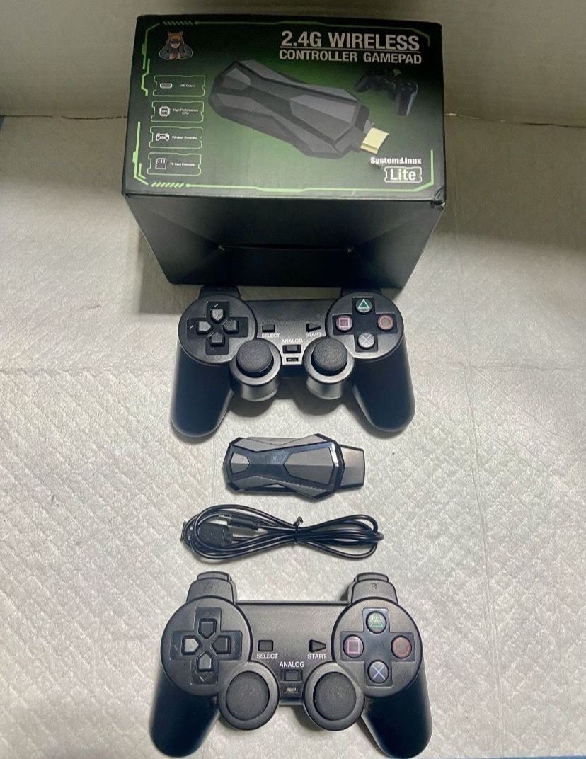 Retro Game Stick. 10,000+ games Built in. Platforms- Nes;SNES;Sega;PS1;PS2;SNK;GB GBA; NeoGeo and many others. Has all the retro games. $20.00***Cash Only**** Includes: -Game Stick -2 wireless Controllers -64gb SD Card -Power Cable. Connects to any HDMI equipped TV. -Is Plug & Play. Hooks up in a few seconds. Controllers Take 2 AA Batteries and last a long time.