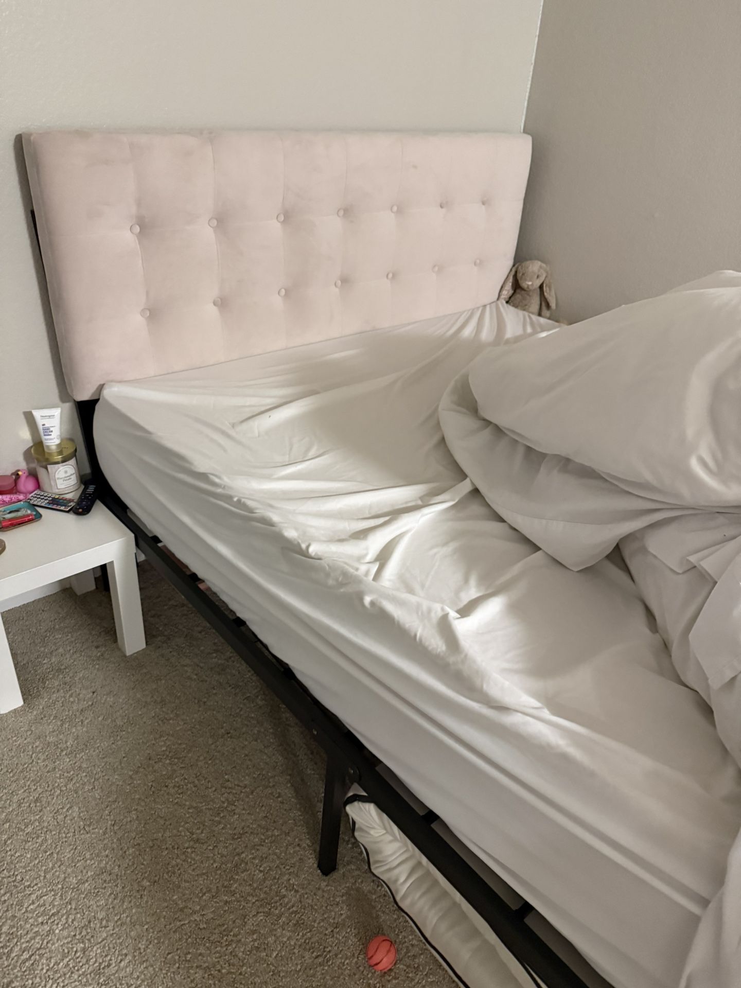 Basically brand new and can carry a lot of weight. Nice light pink velvet headboard